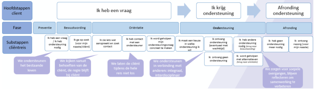 In de paarse tekstwolkjes staan beloften die we aan cliënten doen tijdens de reis. Deze beloften passen bij de visie van Vereen. Ze laten zien dat we de cliënt ondersteunen in het eigen leven en dat de regie bij de cliënt blijft. De cliëntreis is nu vastgesteld. Het is de basis om alle processen, beleid en afspraken beter op elkaar te laten aansluiten. In 2025 werken we aan nieuwe thema’s: